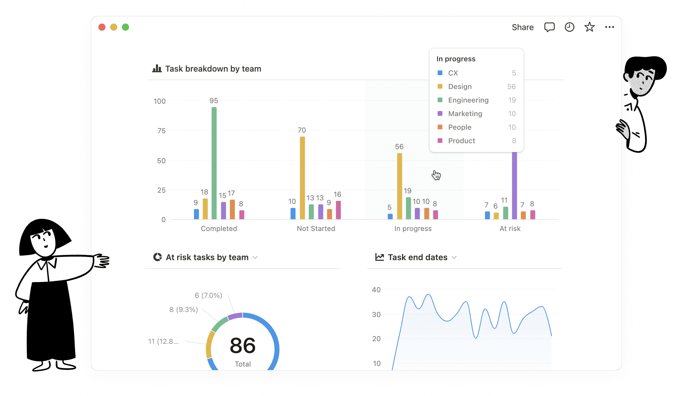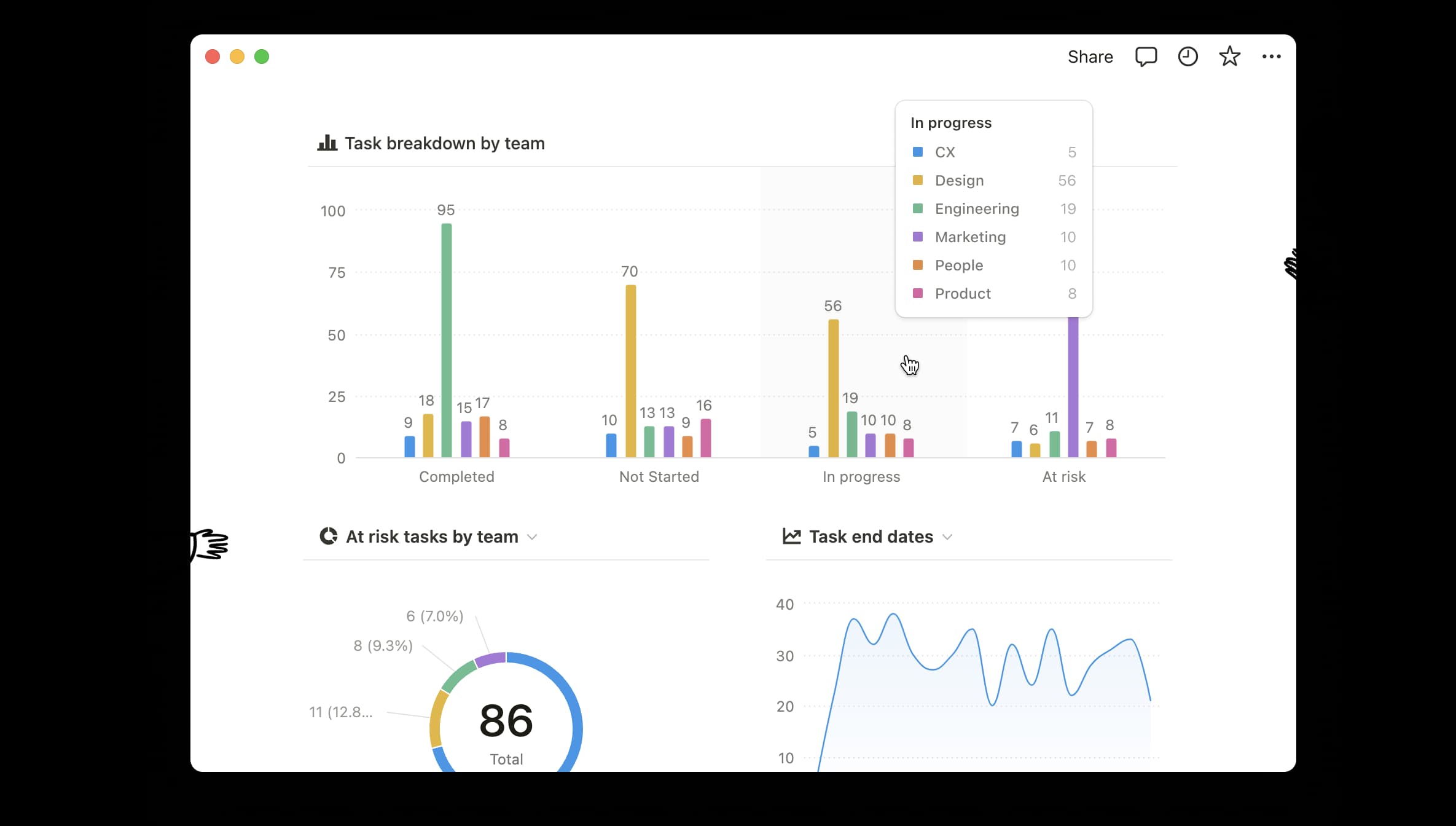 Create charts to monitor progress in tools you’ve connected to Notion like Jira and GitHub.